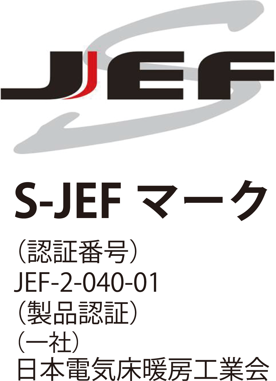 (一般社団法人)日本電気床暖房工業会の基準に適合した商品になります。 認証を得るには、S-JETの認証を受け、さらに(一般社団法人)日本電気床暖房工業会が定めた40数項目にのぼる試験を実施後、外部委員を含む認証表示委員会による安全についての審査を受け合格した製品が認証を得られます。合格した製品には「S-JET」認証マークと「S-JEF」認証マークを併記して表示しています。 S-JET認証にS-JEF認証を更に加えることで、より一層の安全性の信頼を示すものです。