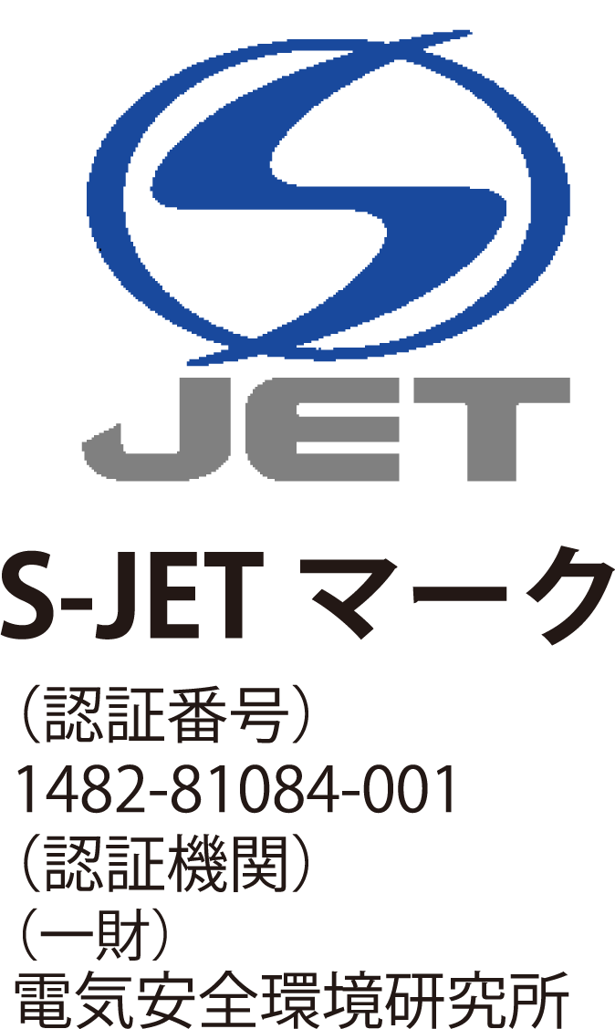 弊社は第三者機関である(一般財団法人)電気安全環境研究所からのS-JET マーク(セーフティ・マーク)を取得しています。 認証を得るには、電気用品安全法の技術基準の要求に適合していることを確認するために、製品試験が行われ、更に年一度の工場検査も行われます。工場検査では自主検査が正しく行われているかチェックし、一定の品質管理体制も要求され、その結果に基づいて認証を得られます。 S-JET認証は製品試験及びその製造工場の品質管理の調査が行われている証です。
